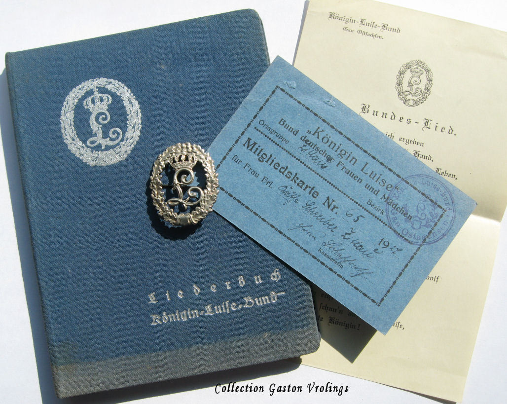 Hieronder iets heel anders: een zangbundel, ledenkaart en ledenspeld van de Königing Luise Bund, de vrouwelijke tak van de Stahlhembund.