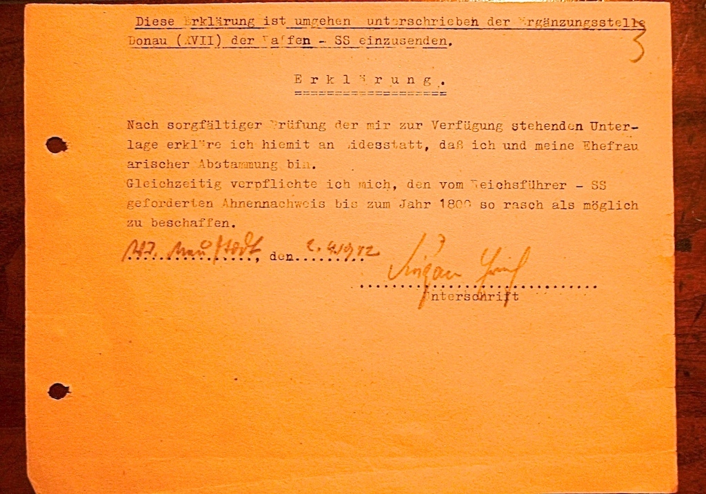 Het volgende document is een verklaring van deze SS-soldaat dat hij en zijn vrouw van Arische afkomst is en verplicht hij zich,de door de Reichsfürher SS vereiste Ahnennachweis