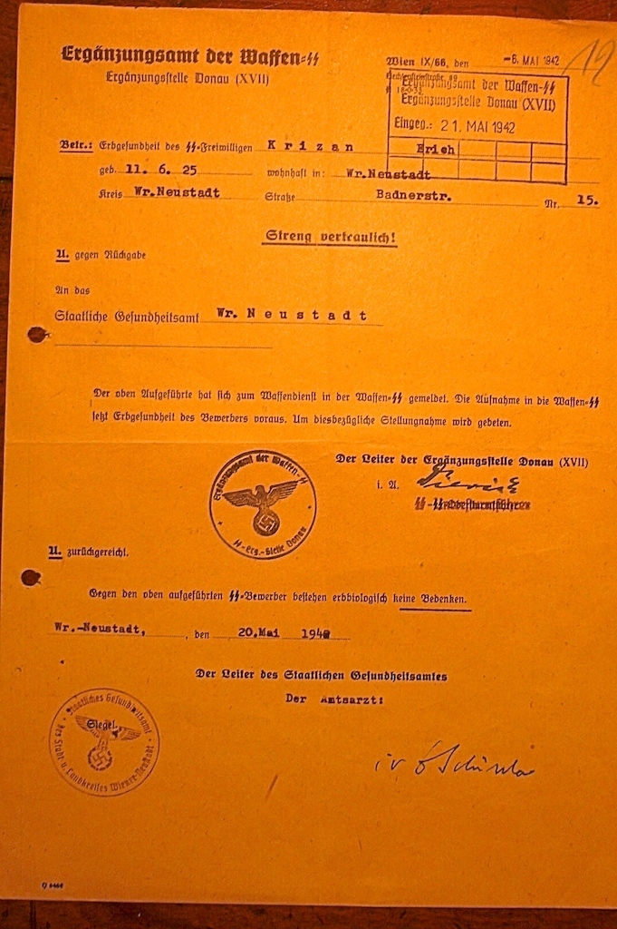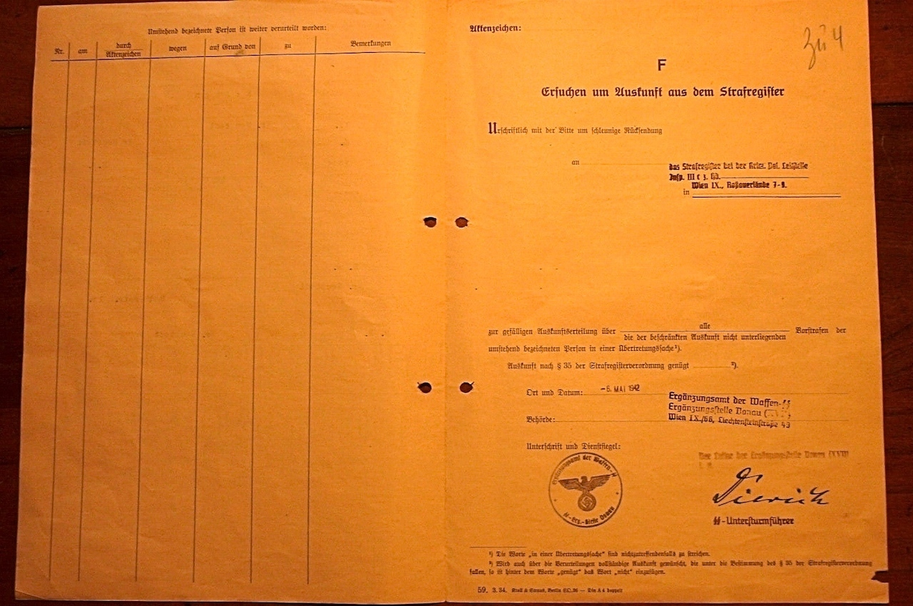 Het volgende document is een bewijs dat er in het strafregister van deze SS geen feiten gevonden zijn,het bewijs werd naar het opleidingsregiment in Praag verstuurd.