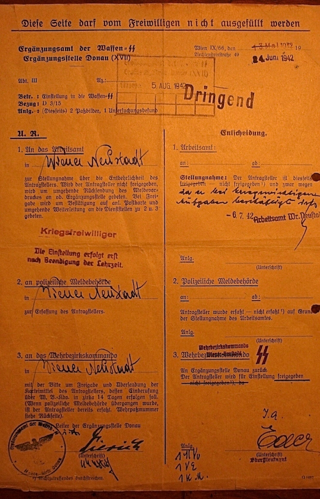 Het volgende document is een melde vordruck für einstellung als Freiwilliger in die waffen SS,wat lastig te vertalen,maar het komt neer op een voorlopige aanmelding als vrijwilliger bij de Waffen SS.