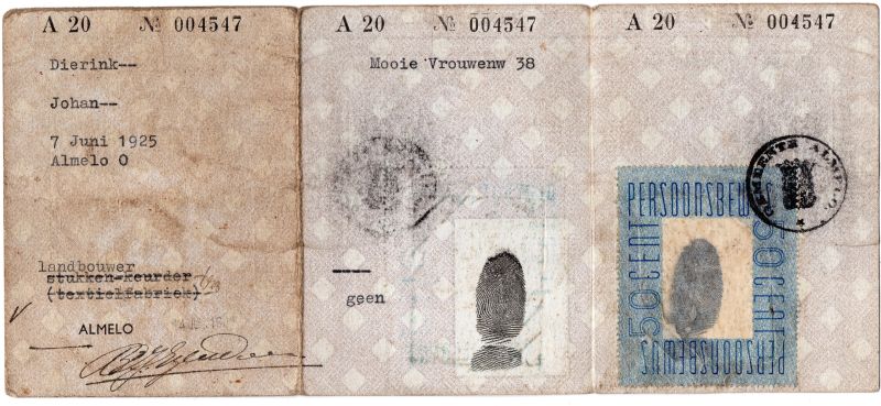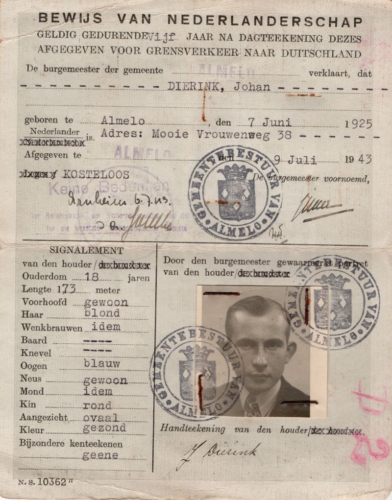 Een 5 tal documenten van J.W.L.F. Mooij hij was postbode in Almelo. Hij kreeg in juli 1944 het bericht dat hij naar Duitsland moest om daar te gaan werken voor de Duitsche Dienstpost. Of hij dat is gaan doen is onduidelijk.. er zat ook een papiertje bij dat hij nog loon moest ontvangen van Vrij Nederland. Dat tijdens zijn onderduikperiode niet was uitgekeerd.