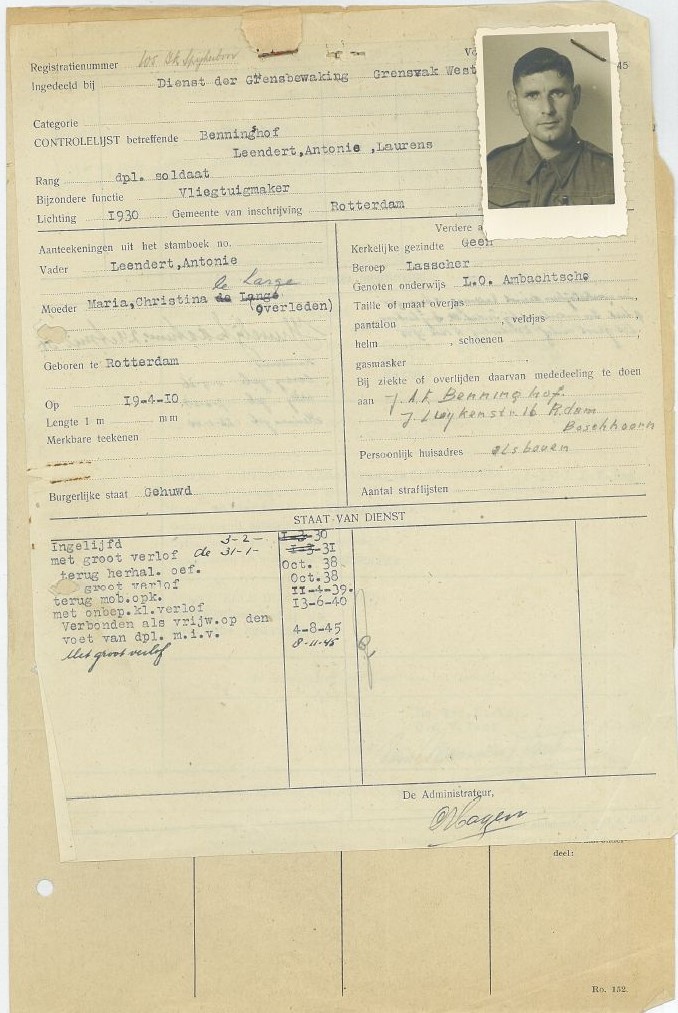 Het L.V.A. herkennigsplaatje van Leendert Antonie Laurens Benningshof. De heer Benningshof van tijdens de meidagen vliegtuigmonteur bij het 1-II-1 Luchtvaart Regiment. Het eerste regiment had haar bases op De Kooy, Schiphol, Bergen, en Waalhaven. Na de oorlog heeft de heer Benningshof nog dienst gedaan bij de grensbewaking grensvak west.
