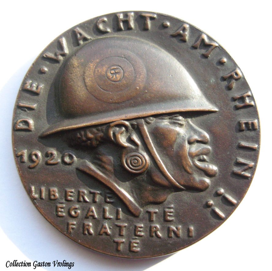 De "Die Wacht Am Rhein/Schwarze Schande" medaille is misschien wel een van de grofste Duitse medailles ooit die je kunt vinden. De symboliek erachter is als volgt: na het verdrag van Versailles na WOI legerden de Fransen met opzet hun (zwarte) koloniale troepen in Duitsland. De meeste Duitsers hadden in die tijd nog geen donkere mensen gezien en het was dan ook een openlijke provocatie juist die troepen in Duitsland te legeren. Veel Duitse vrouwtjes waren echter wel gecharmeerd van deze mannen en een krap jaar later werden er ineens een heleboel halfbloed kindjes geboren. Voor veel Duitsers was dit een verschrikkelijke schande en vernedering, vandaar dat men sprak van de zwarte schande!