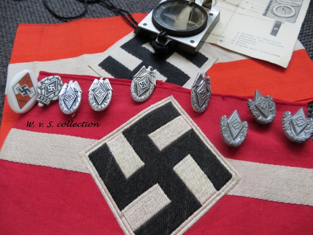 HJ mouw/armbanden waarvan één met RZM etiket. Een marskompas met gebruiksaanwijzing. En wat siegernadeln van 1934 t/m 1942