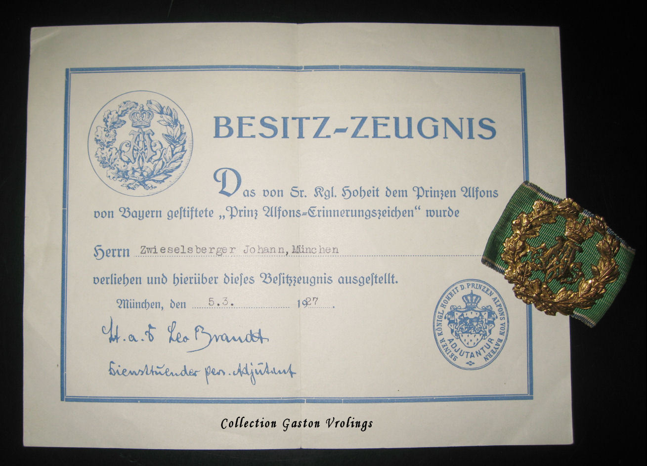 Voor vandaag weer wat anders: Prinz-Alfons-Erinnerungszeichen in gold, met oorkonde en groen lint voor Schützenvereine: