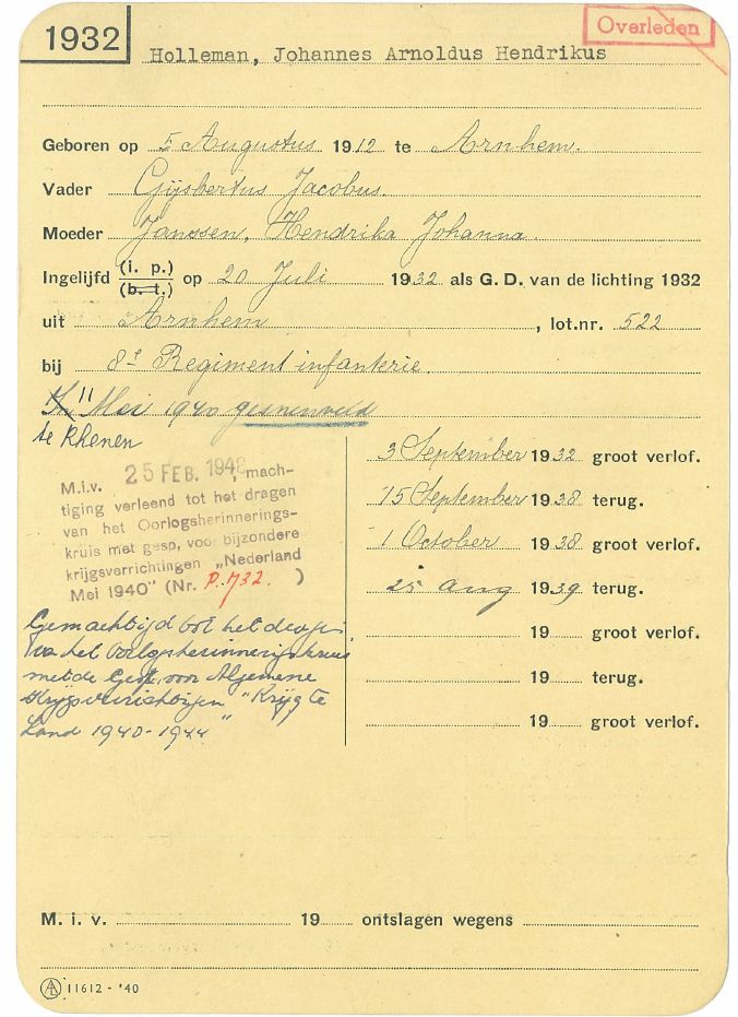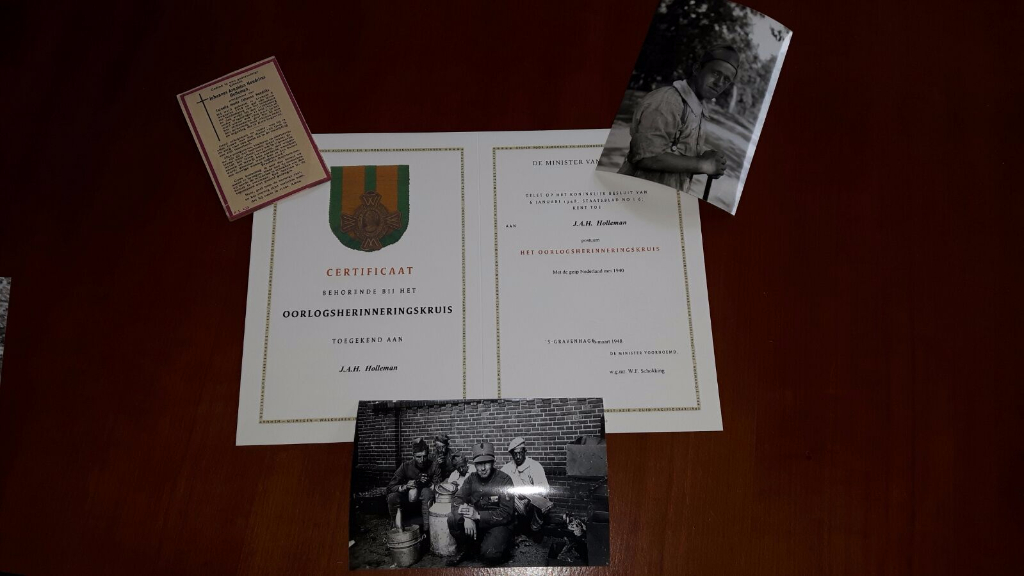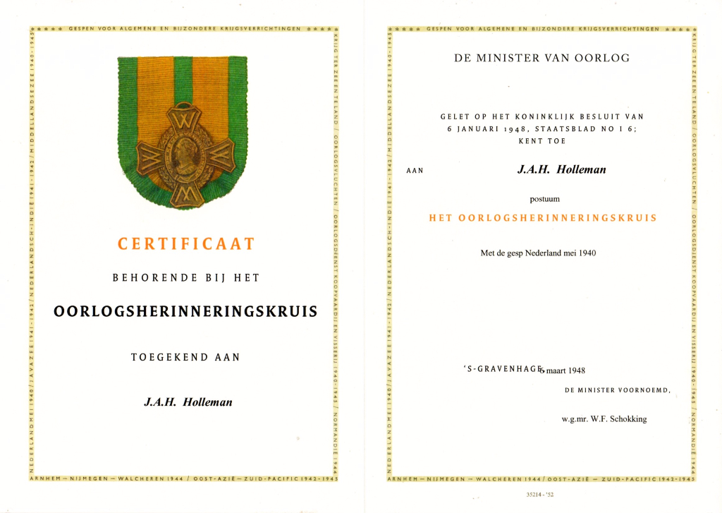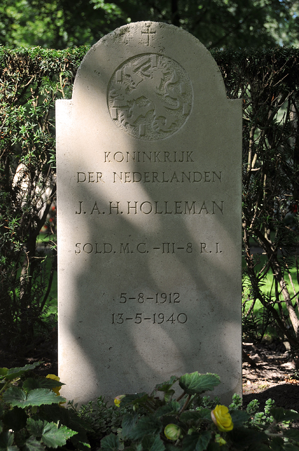 Het bidprentje en de oorkonde van het Oorlogshernneringskruis van Dienstplichtig soldaat Jo Holleman,was kok bij het MC-III-8.RI , hij stierf op 27-jarige leeftijd op 13-5-1940. Omgekomen in de stoplijn, waarschijnlijk toen de Duitsers hun aanval hervatte. Hij was met een stuk zware mitrailleurs meegetrokken en lag in de stoplijn in een stelling. hij weigerde terug te trekken. Op 18 mei 1940 werd hij gevonden in het bos tussen het noordelijke gedeelte van de roggeakker en Ouwehand's Dierenpark, nabij de stelling van de 1e Sectie 2-III-8.RI in een greppel.