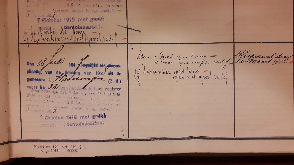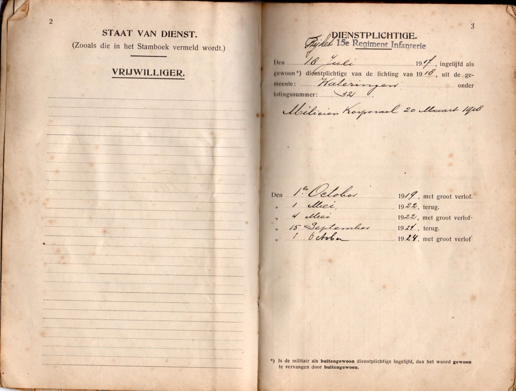 Na aanleiding van het artikel over mijn oud oom Jan Tanke wat op 22 mei in de krant stond reageerde via facebook ene Jan Tanke..... Jan Tanke is een neef van mijn vader en ook altijd zeer geïnteresseerd geweest in het verleden van mijn oud oom en zijn oom. Na een paar berichten dezelfde week nog afgesproken bij hem thuis om het Indië album te laten zien van Jan Tanke wat ik heb. Toen kwam er nog iets te voorschijn bij hem uit de kast............... Het zakboekje van mijn overgroot opa. Uit 1917 met ontslagbrief uit 1938 en zijn persoonsbewijs. Alles mooi ingescand toen Jan hier was. Hij was op 18 juli 1917 ingelijfd bij het 15e Regiment Infanterie. Op 20 maart 1918 bevorderd tot korporaal en op 1 oktober 1938 ontslagen uit militaire dienst. Vorige maand naar het nationale archief geweest om te kijken of ik nog iets de stamboeken kon vinden bij welke compagnie hij zat. Maar daar stond niet veel meer info in dan al in het boekje staat (helaas) Via defensie kreeg ik vandaag dit bericht: