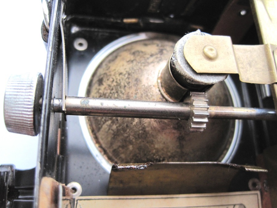 Tevens het inwendige van de Pertrix nr 646 /1934 die geheel uit messing vervaardigd is met 3 filter in de filterkleuren