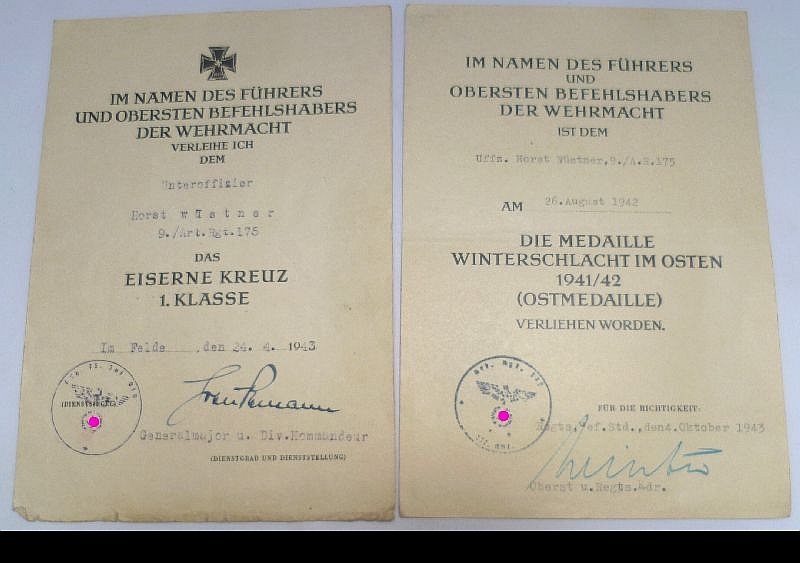 Urkunden zum Eisernem Kreuz 1.Klasse 1943 (mit Original Unterschrift von Ritterkreuzträger Generalleutnant Helmuth Beukemann),