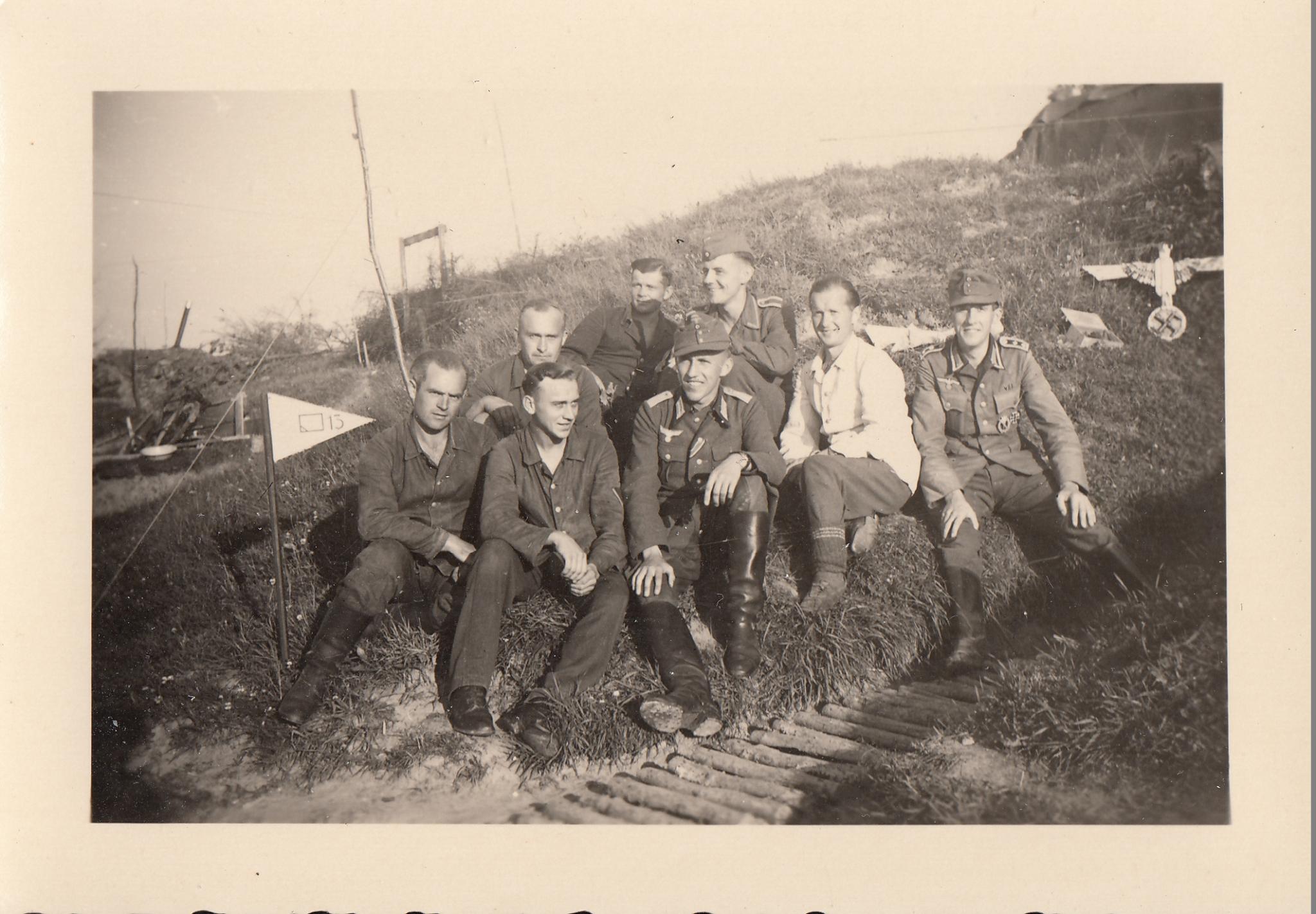 Een Leutnant met ek2 lint en helemaal rechts een oberfeldwebel met infanterie sturmabzeichen, ek1 en iets dat lijkt op een ek2 spange.