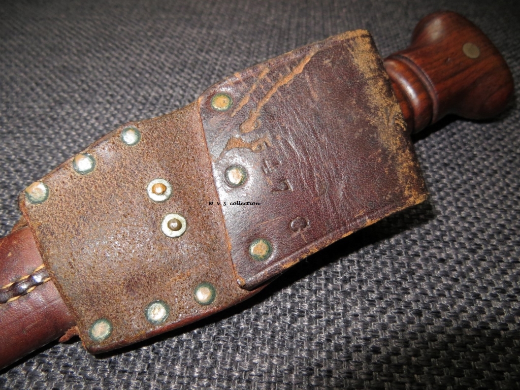 In principe zijn de stormdolken op zich niet te herleiden naar iemand. Het enige wat je tegenkomt op de Stormdolk M-1917 zijn wat ingeslagen cijfers en letters. In dit geval 8547C (serie of productienummer) op de stootplaat en op de achterzijde van de lus van de schede. CW (Constructie Werkplaats) ook op de schede aan de voorzijde. Vaak staan er ook nog één of meerdere letters in het leer aan de onderzijde van de schede ingeslagen van de leder fabrikant. En dan op diverse plekken een kroontje met een letter Z eronder. Als ik het goed heb was dat het tekentje van de keurmeester.