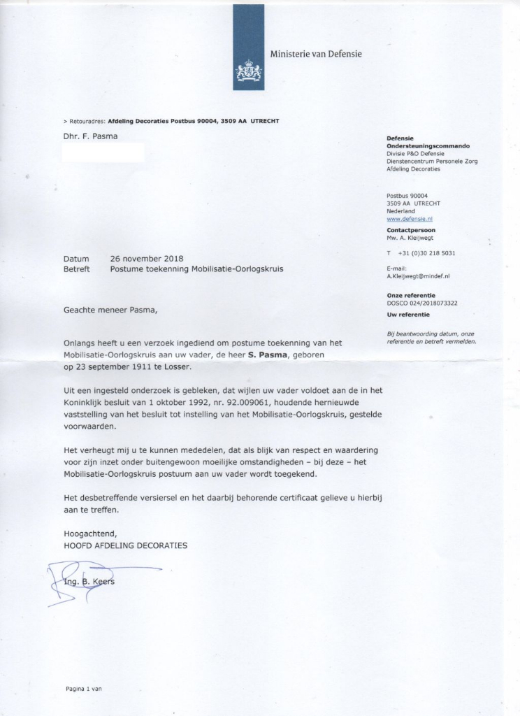 Het Mobilisatie-Oorlogskruis van de heer Pasma.