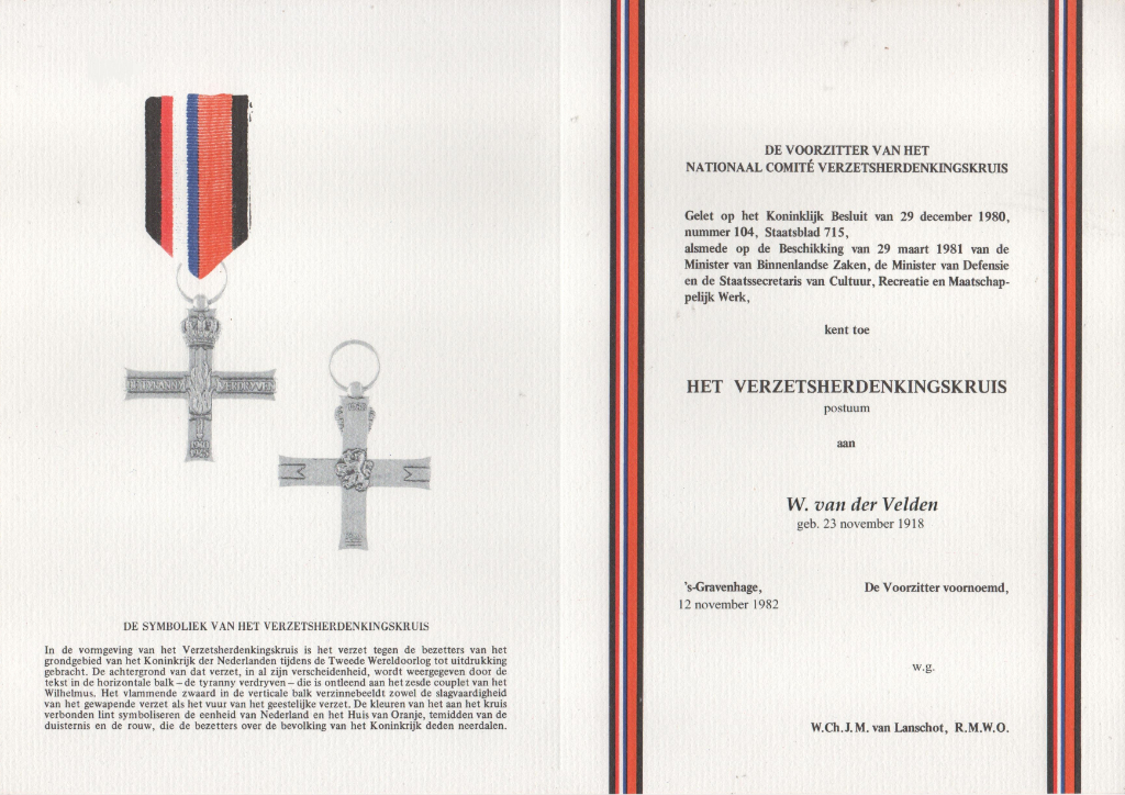 De oorkonde van zijn postuum uitgereikte Verzetsherdenkingskruis: