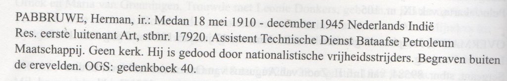 Bron: https://indisch4ever.nu/2009/07/06/by-ivo-pabbruwe/Wij waren toen 3 en 5 jaar oud en leerden onze Vader kennen. Amper 3 mnd later in DEC 1945 ging Vader naar de markt en is daar van nooit terug gekeerd. Waarschijnlijk opgepakt door de Republikeinen. Vermist verklaard. Er is nooit iets van hem gevonden.