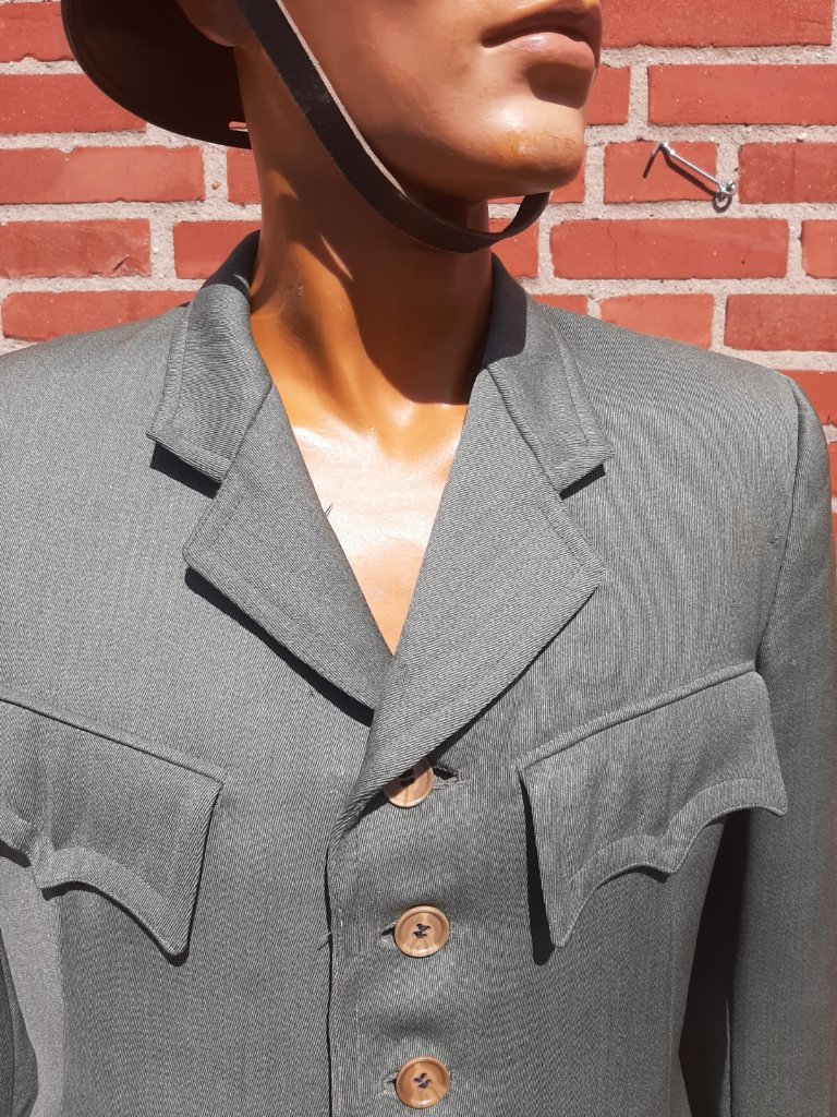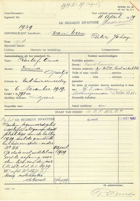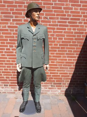 Het buiten model uniform van Pieter Johan van Veen, geboren op 6 november 1919 te Uithuizermeeden. Op 29 augustus 1939 in dienst gegaan bij de 7e compagnie 12e Depotcompagnie. Later bij de 4e compagnie. En op 10 mei 940 onder gebracht bij het 2-10e Grensbataljon. Wat als taak had de telefooncentrale in Wijk aan Zee te beveiligen. Deze lag aan de rand van stelling IJmuiden. HELAAS na mei 1940 omgebouwd tot zondagspak..
