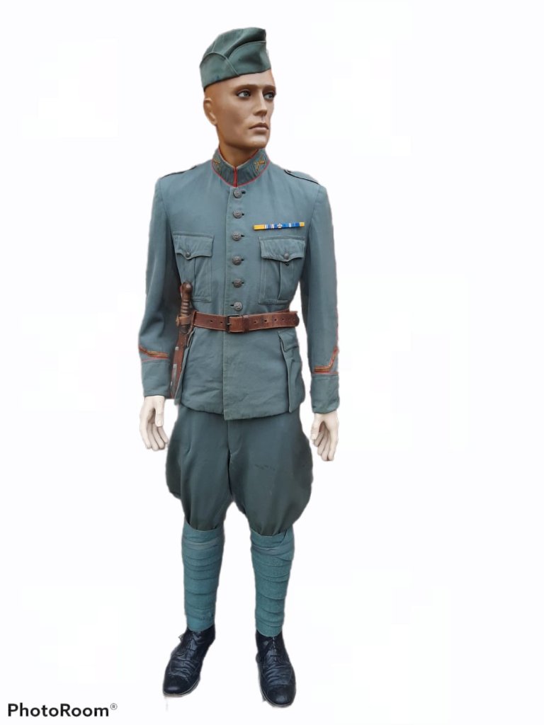 Het uniform van Sergeant-menagemeester Willem Groeneveld uit Almelo. Tijdens de mobilisatie van 1939-1940 ingedeeld bij het MC-III-19e Regiment Infanterie. Wat gelegerd was bij de Grebbeberg. Daar is hij gewond geraakt en later als krijgsgevangene afgevoerd naar Duistland. En komt op 9 juni weer terug naar Nederland. Het toeval wil dat zowel mijn opa bij het 19e Regiment Infanterie was ingedeeld (vanaf 27 maart 1940 bij het 3-II-11e R.I.) als mijn oud oom MC-II-19e R.I. 2e stuk, en de opa van mijn vriendin staf-19e R.I. en ook bij zaten en ook alle 3 uit Almelo kwamen.