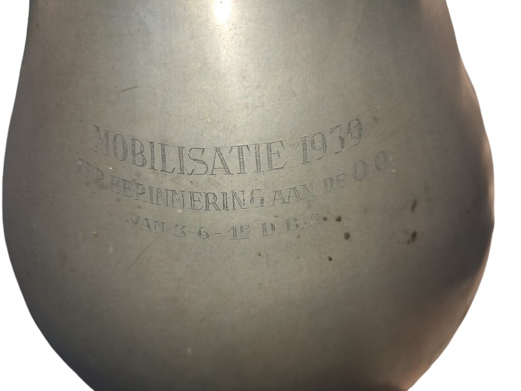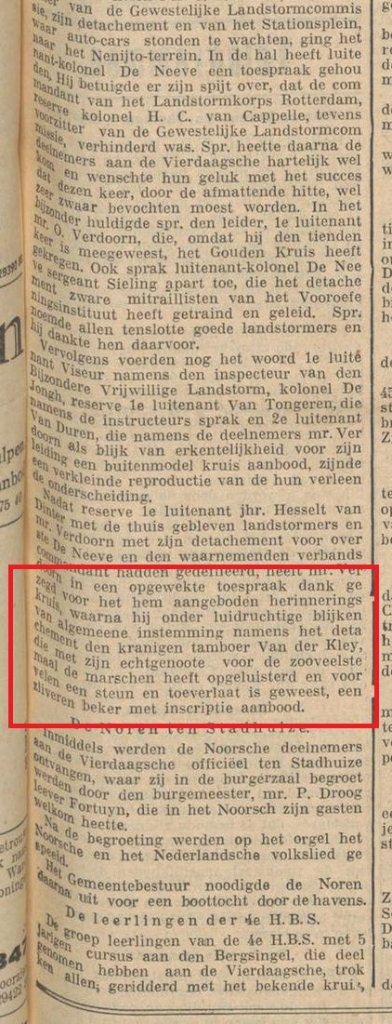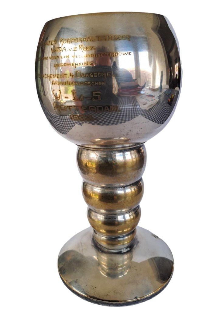 Deze beker werd uitgereikt op 29 juli 1933 door 1e luitenant mr. O. Verdoorn aan de korporaal tamboer Willem Frederik Antonius van der Kley, van het Vrijwillige Landstormkorps Rotterdam.