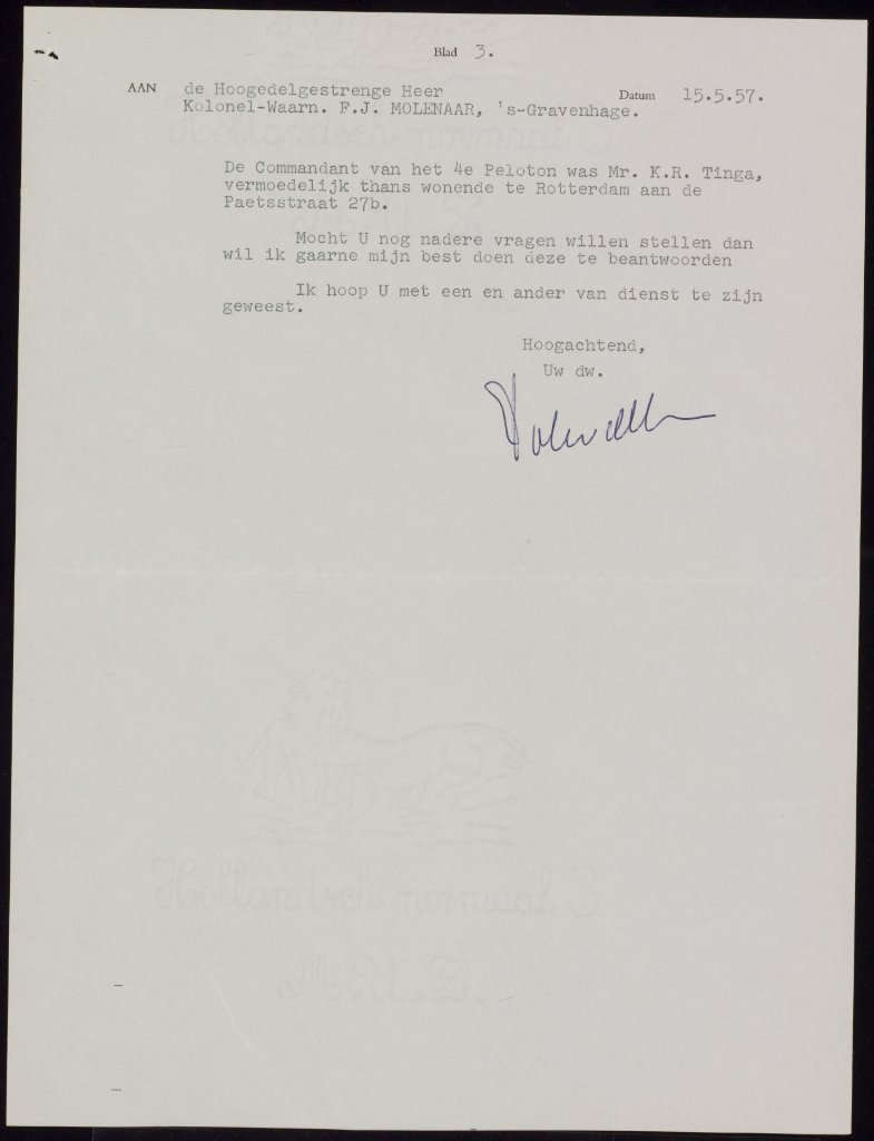 Mijn geachte kolonel, mogelijk hebt U aan het bovenstaande genoeg? Vanzelfsprekend ben ik gaarne bereid, voor zover in mijn vermogen ligt, U met verdere inlichtingen van dienst te zijn om de geschiedenis van de 3e Cie recht te doen wedervaren.
