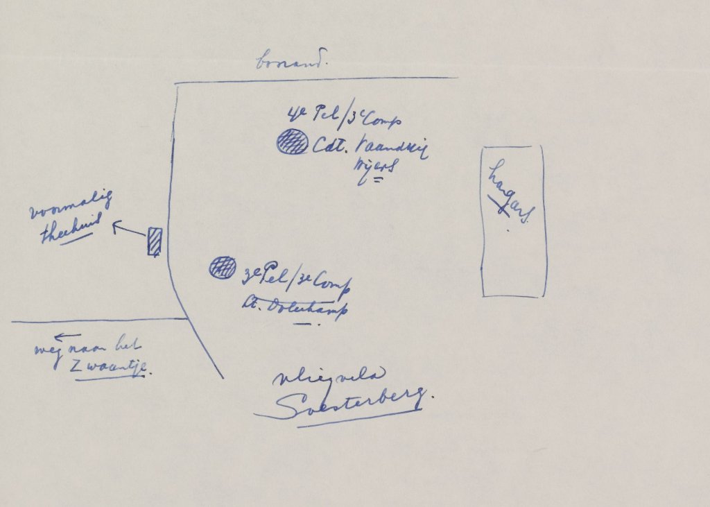 2e. Drie van de pelotons stonden op het vliegveld, waarbij het op een landing, toen na een onbekend moment ook de staf bevond welke in een der gebouwen op het vliegveld. Het vierde peloton alsmede de 15e batterij 4e stonden oostelijk van Amersfoort bij Voor de Grebbekanaal. De taak van de 3e Cie was dus verdeeld over 2 objecten. Ik kan globaal – al ?? die mensen die ik u noemde hun positie namelijk mag beter kennen – nog wel op een schetsblad aangeven waar de pelotons en de batterij zich bevonden. Van de batterij weet ik de plaatsen van de stukken niet precies.