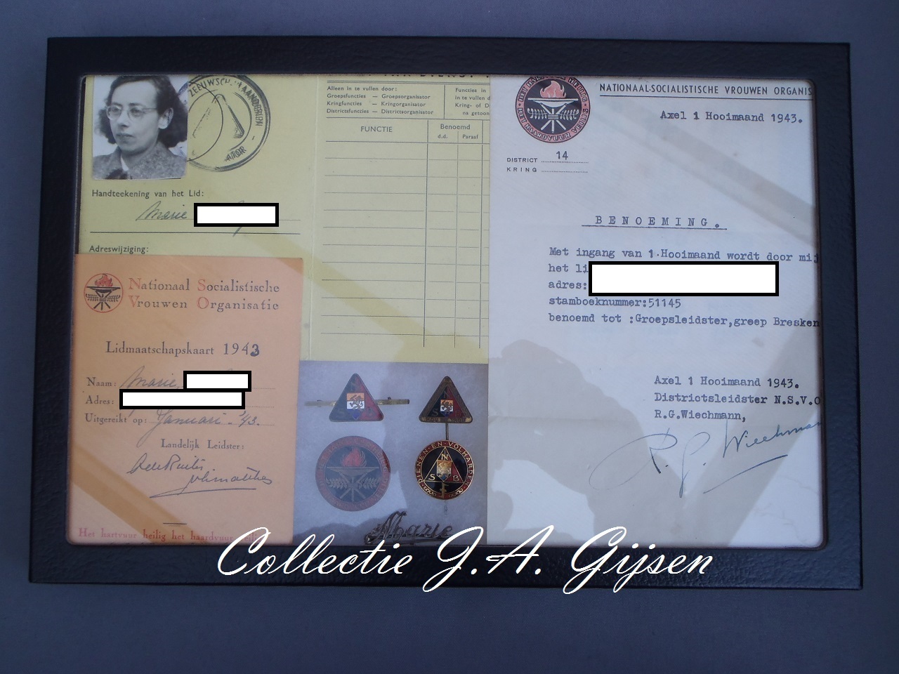 Dit genummerde N.S.B. vijfjarenspeldje behoorde toe aan de drager van deze Lidmaatschapskaart van 1943/'44