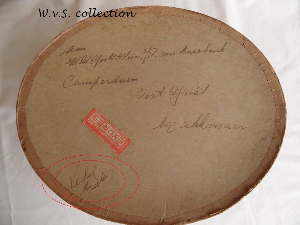 Ik zal dat aan de hand van twee foto's laten zien. Ook zal ik op beide foto's hetgeen ik bedoel met rood omcirkelen. Eén foto van jou en één foto van mij. Ik ben er nog niet achter wat er nou precies staat. Misschien is het bij jou beter te lezen. Het meest voor de hand liggend is dat er staat van Hal Breda, maar dat weet ik niet zeker. Feit is wel dat allebei de dozen van dezelfde maker komen (kepie hoogstwaarschijnlijk ook) en met hetzelfde handschrift zijn beschreven. Leuk toevalletje.