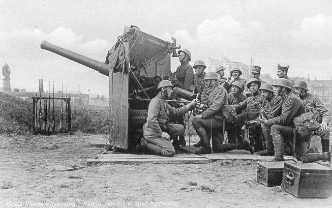 Hier een foto van kustartillerie geschut uit Vlissingen, let op de persoon hurkend links.