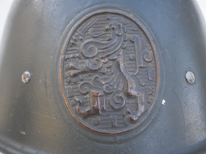 Originele helm met koperen plaat na-oorlog bevestigd, deze hoorde nooit op zwarte helmen te zitten.