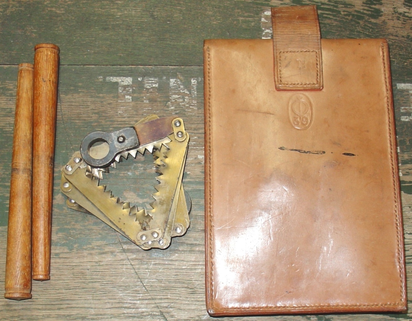 Nog wat, mocht iemand een idee hebben wat er in de zeildoektas 1932 hoort, graag doorgeven. Is zo'n 35 cm lang en onder een doorsnede van 9 cm, lijkt of er iets met een handvat in hoort gezien de insnede aan de zijkant.