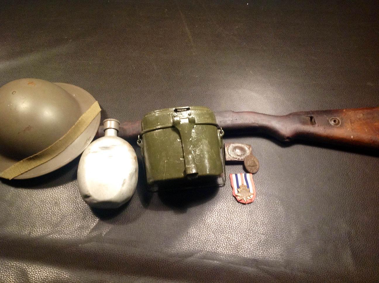 Het wordt een leuke verzameling zo. Toch even wat opmerkingen m.b.t. het Mosin Nagant geweer. Uit één van je eerdere reactie's heb ik begrepen dat het om een Finse doorgebruikte Mosin Nagant M1891 gaat. Veel van deze buitgemaakte geweren werden door de Finnen aangepast met eigen gemaakte onderdelen of met onderdelen van andere Mosin Nagant geweren. Het is dus goed mogelijk dat je Mosin Nagant onderdelen heeft waarop (Sovjet) Russische merktekens staan.