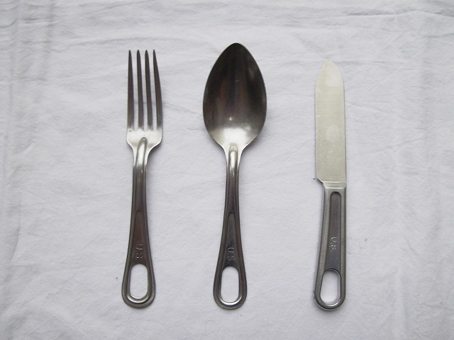 U.S. mes, vork en lepel. Waarvan het mes replica is denk ik (SEMS 1942), lepel: DS Stainless, vork: Silco Stainless.