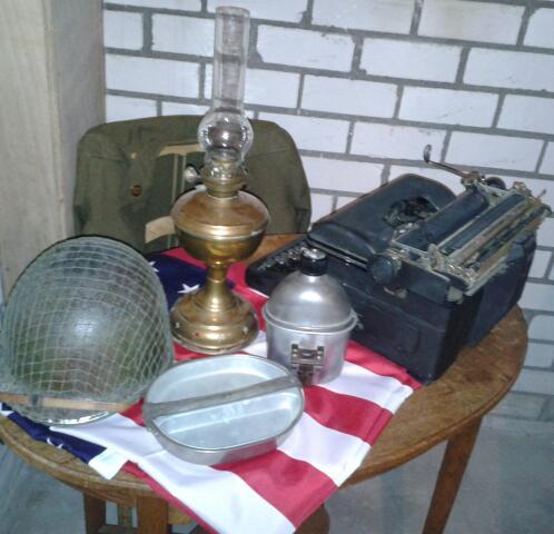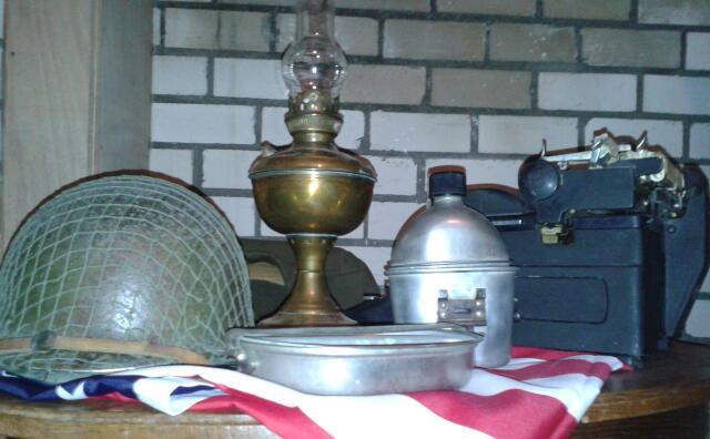Veldfles zo plaatsen alsof de typist er zo uit zou kunnen drinken. Eventueel een namaak appel op tafel.(Typen maakt hongerig. Een M1928 haversack half onder het tafeltje. Misschien een veldtelefoon nog op het tafeltje?