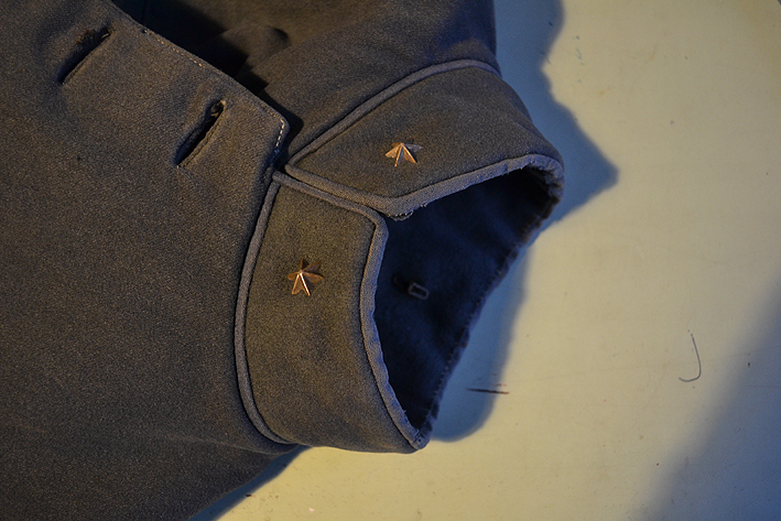 Aan de binnenzijde van de jas zijn aanzetten voor epauletten te zien: een restant van een knoopverbinding en twee restanten van een passant? naaisel waar de epaulet doorheen ging? De afstand hiertussen is zo'n 9,5 cm.