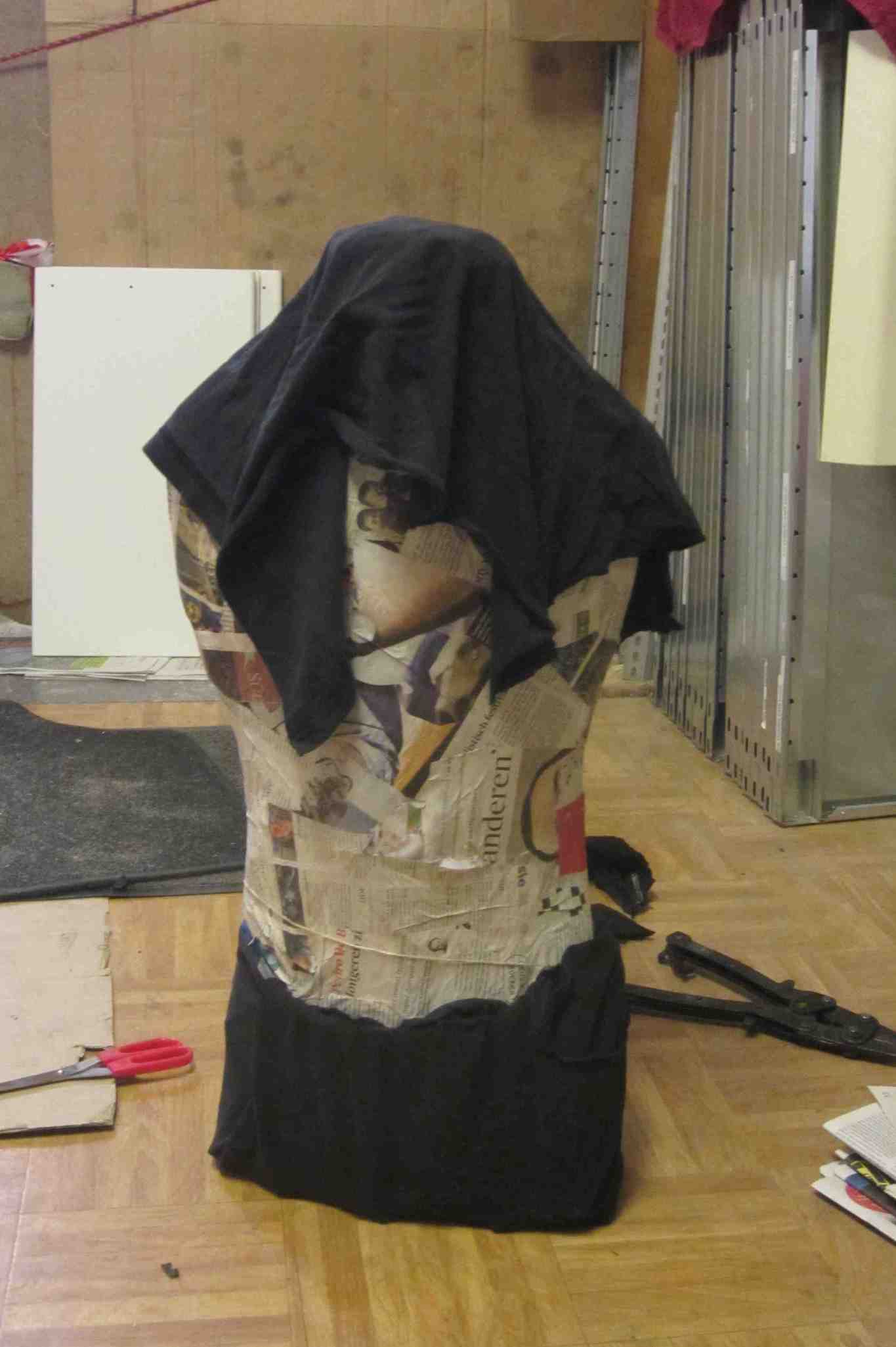 Ik heb gewoon de kop aan de nek op 2 verticale balkjes geschroefd (ca. 60 cm lang), de andere kan van de balkjes op een ovaal houten plankje. Vervolgens alles tussen de kop en de plank (waar de buste zeg maar op staat) opgevuld en gevormd met proppen krant en vastgetaped. Als afwerking dan een laagje bubbelplastic zodat alles mooi strak is. Een laagje textiel is natuurlijk ook een optie.