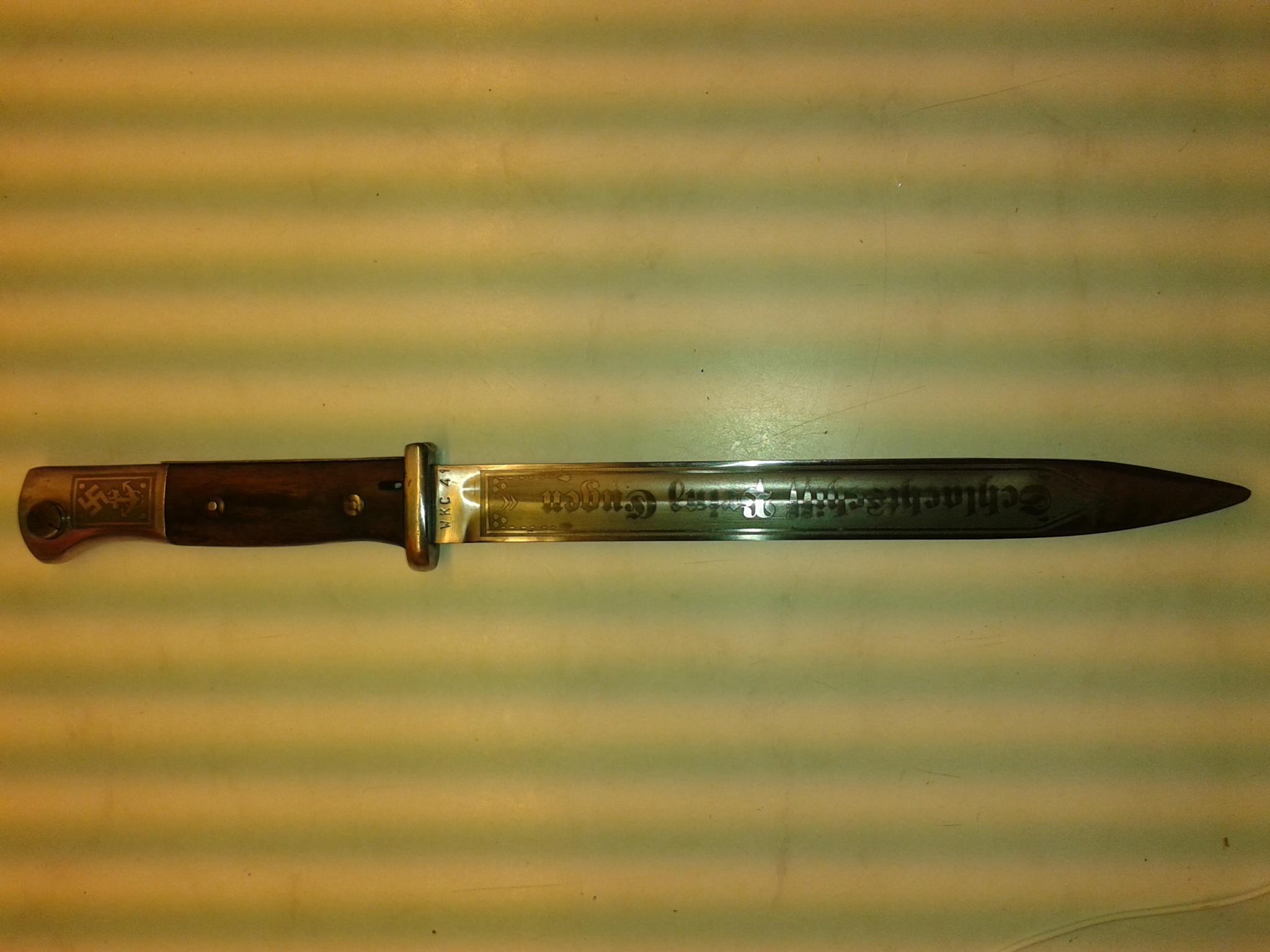 Als ik het goed begrijp is hij dus waarschijnlijk opgevrolijkt in de jaren 70, op het internet word wel gezegd dat er originele bajonetten zijn alleen zijn die erg zeldzaam en moeilijk te onderscheiden van echte. Ik moet er wel bij zeggen dat ik de gravure mooier zijn dan de meeste die ik heb gezien en, niet zo overdreven als vele andere bajonetten met gravure en redelijk in de stijl van de jaren 40.