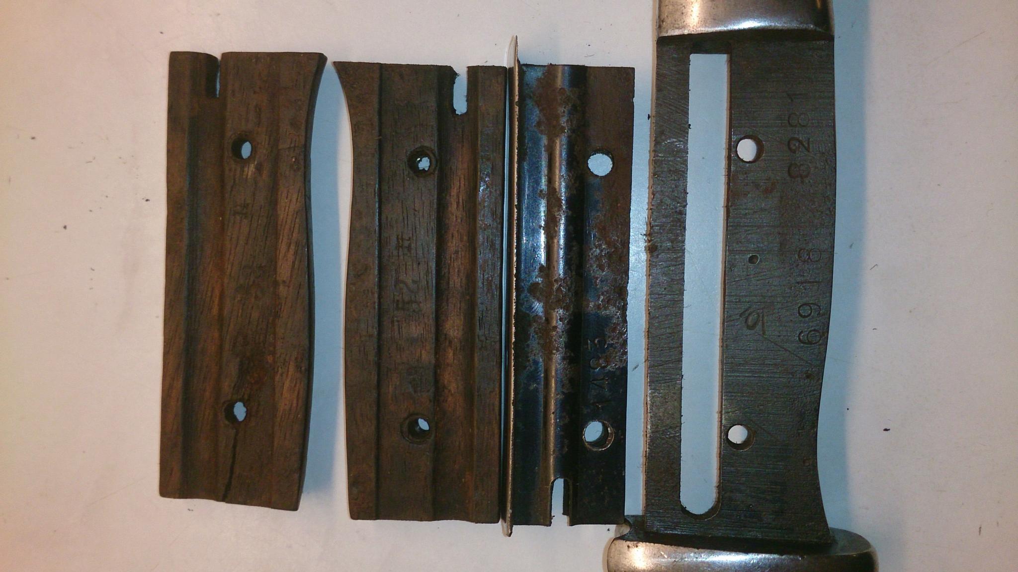 ik heb nog eventjes wat rond gekeken, en onderzocht op het internet, Los gravure weet ik nog steeds niet of de bajonet wel echt is er staat aan de binnenkant van de pommel een serie nummer 9797 met een stempel, ook in de binnen kant van beiden houten handvatten staan de nummers 52 en een Romeinse 2 met . Op de bajonet zelf heb ik nog op het gedeelte onder de handgrepen de volgende nummers gevonden: 6918 en 8281 een gek teken dat hier op lijk ->/0/ . voor de rest staat er nog op de Flashguard1483, het zijn allemaal verschillende cijfers, ik zie geen verband tussen de cijfers, kan iemand me hier meer over vertellen? Is het gewoon een bijeen geraapte bajonet? of is dit vrij normaal?
