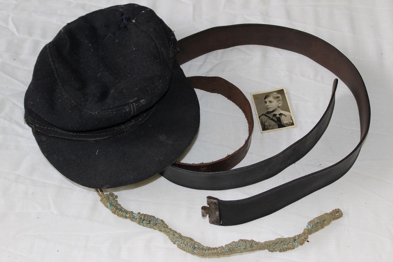is moeilijk te zeggen, op de pet hoort een hj patch op te zitten, deze is mogelijk verwijderd moest het orgineel materiaal zijn dat doorgebruikt werd, maar dan moet er toch een aftekening van het ruitje aanwezig zijn, en dat is niet te zien op de foto's, ook zit er normaal in de binnenkant in de grote ruit een stempel, en die is niet aanwezig. zou dus best om een vroege repro kunnen gaan, riempje lijkt me wel echt, handig zou ook zijn om te weten of het van dezelfde persoon is, nog beter zelfs moest het zijn van de persoon op de foto, dan is er geen twijfel meer mogelijk.