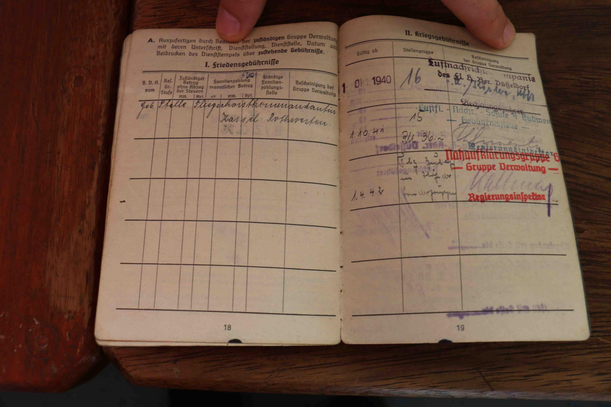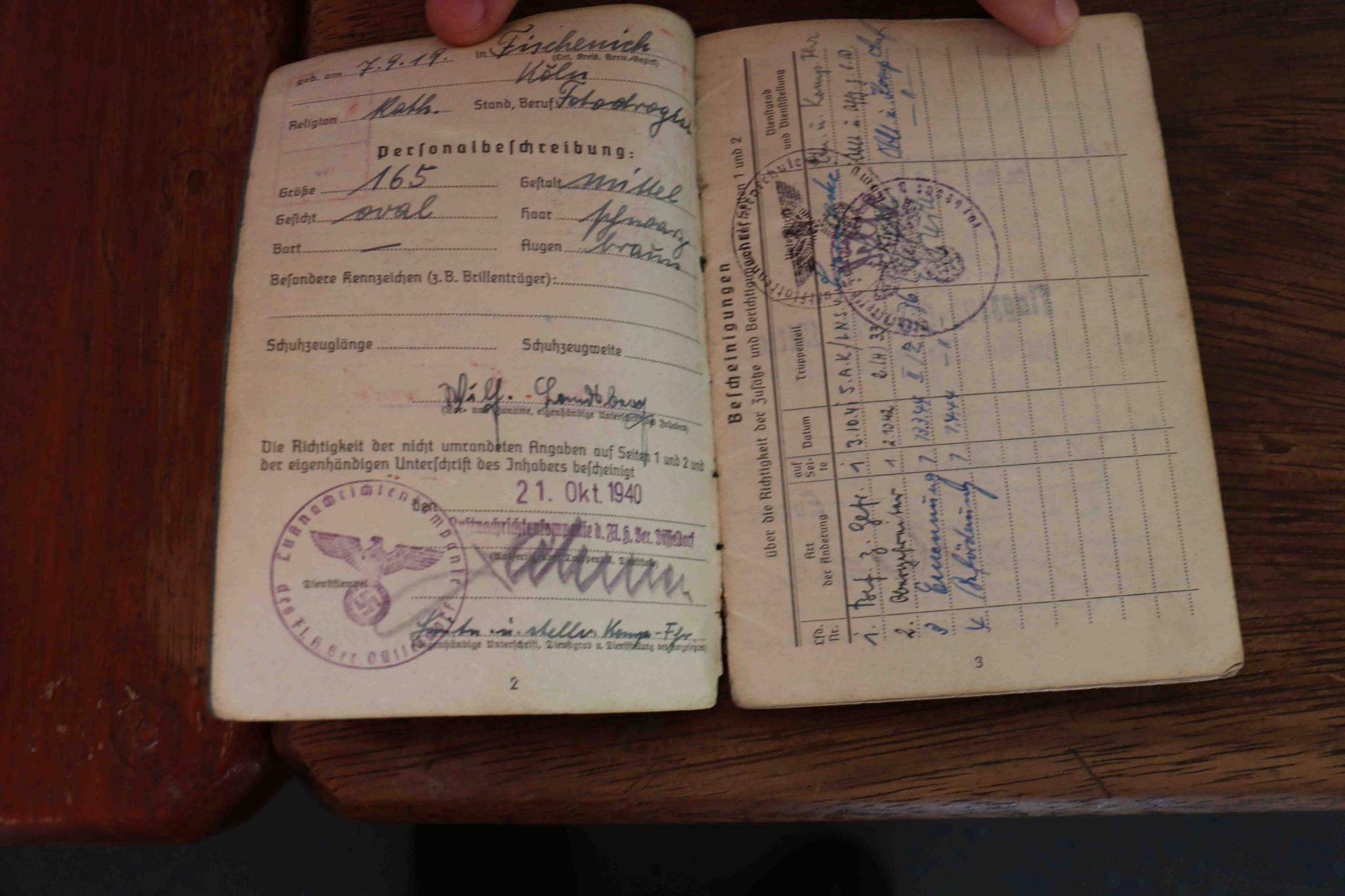 Ik weet ondertussen reeds dat deze bij een luftnachrichtenkompanie op het vliegveld van Dusseldorf heeft gediend. Hij is onderscheden op 30/1/1945 met een kriegsverdienstkreuz 2de klasse. Maar tot daar loopt mijn kennis over dit soldbuch, ik kan er niet echt aan uit. Bij het soldbuch zitten ook twee papieren van zijn ontslag uit het leger.