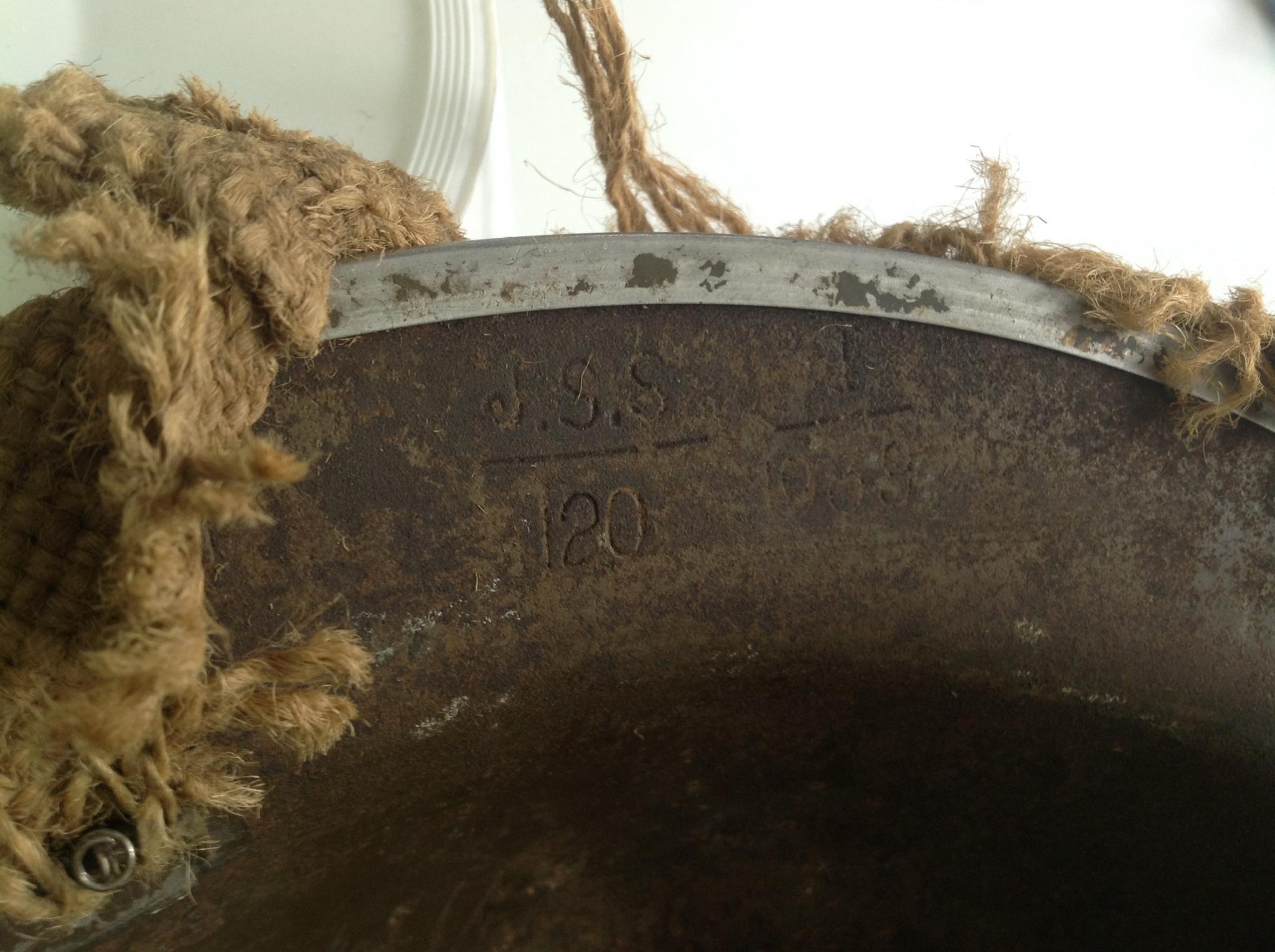 Thv de aansluiting van de kinriem kom ik volgende (zeer moeilijk leesbaar) letters en cijfers tegen.
