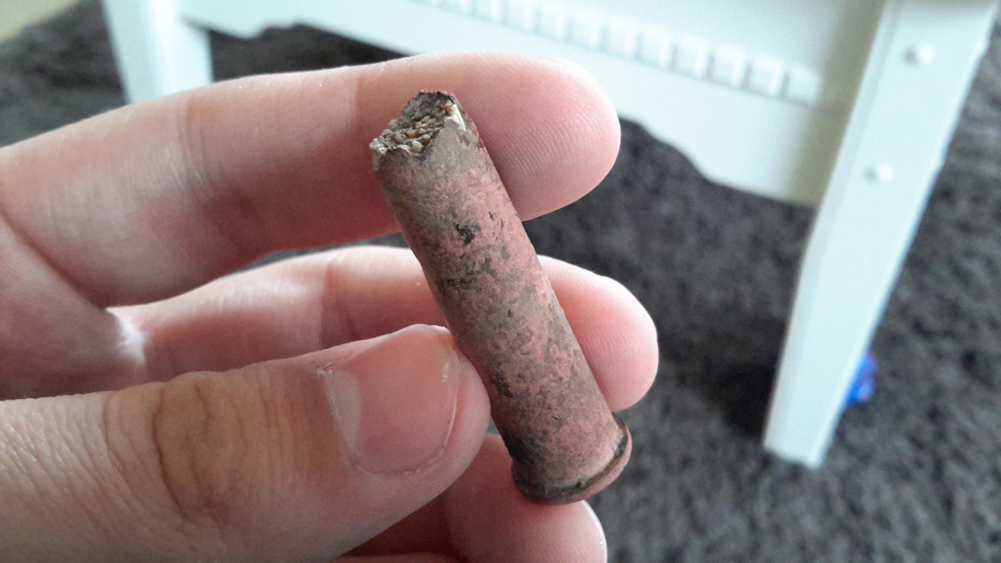 Een maand geleden ben ik begonnen met het gebruiken van een metaaldetector om de bodem bij ons op het land te onderzoeken. Hierdoor heb ik inmiddels al 4 afgeschoten hulzen gevonden, waarvan de eerste drie uit de tweede wereldoorlog (2 Duitse en 1 Britse). Vanochtend heb ik de vierde huls gevonden, maar na het schoonmaken heb ik op basis van de markering op de onderkant niet de identiteit kunnen vinden van deze huls.
