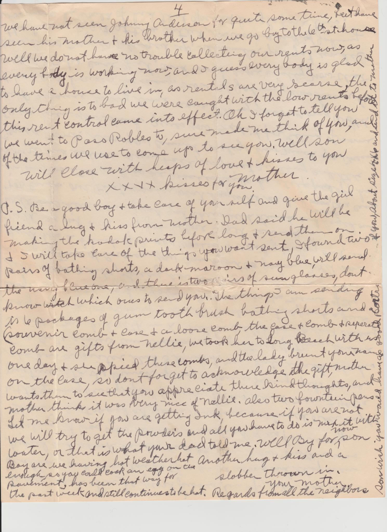 We have not seen Johnny Anderson for quite some time, but have seen his mother + his brother when we go by to the …..house, Well we do not have no trouble collecting our rents now, as everybody is working now, and I guess everybody is glad to have a house to live inm as rentals are very scarse, the only thing is to bad we were caught with the low rents before this rent control came into effect. Oh i forgot to tell you we went to ?Paso Robles? To, sure made me think of you, and of the times we use to come up to see you, well son will close with heeps of love + kisses to you. XXX kisses for you. Mother