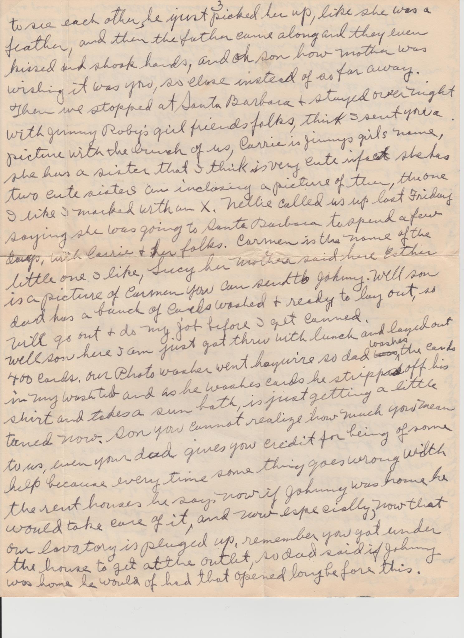 To see eachother, he just picked her up, like whe was a feather, and then the father came along and they even kissed and shook hands and oh son how mother was wishing it was you, so close instead of so far away. Then we stopped at Santa Barbara + stayed overnight with Jimmy Ruby’s girlfriends folks, think sent you picture with bunch Of us, Carrie is Jimmy’s girl name, she has a sister that I think is very cute infact she has two cute sisters am inclosing a picture of them, the one I like I marked with an X. Nellie called us up last Friday saying she was going to Santa Barbara to spend a few days, with Carrie + her folks. Carmen is the name of the little one I likem Lucy her mother said here Eether i a picture of Carmen you can send to Johnny. Well son dad has a bunch of cards washed + ready to lay out, as will go out + do my job before I get canned, well son here I am just got thru with lunch and layed out … cards, our photo worker went haywire so dad washes the cards he stripped off his shirt and takes a sun bath, is just getting a little tanned now. Son you cannot realize how much you mean to us, even your dad gives you credit for being of some help because every time something goes wrong with the rent houses he says now if johnny was home he would take care of it, and now especially, now that our lavatory is plugged up, remember you got under the house to get at the outlet, so dad said if johhny was home he would of haf that opened long before this.