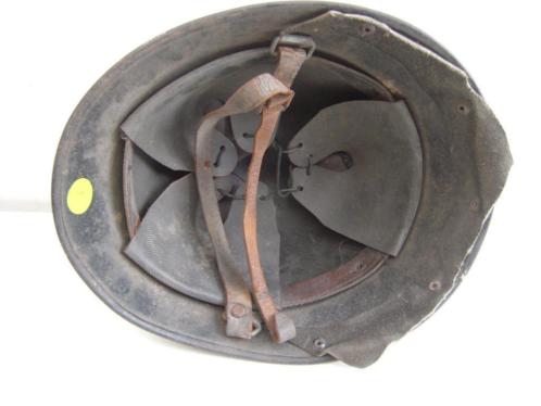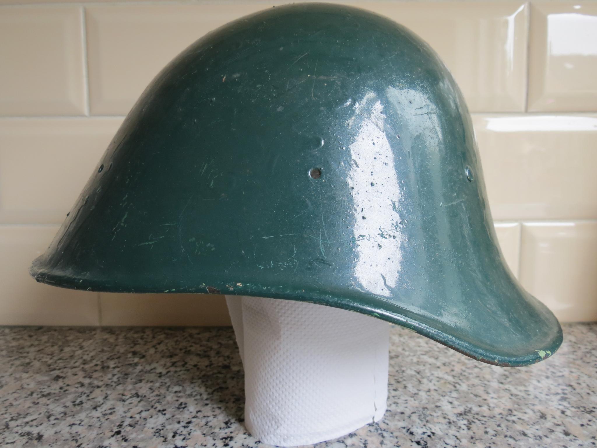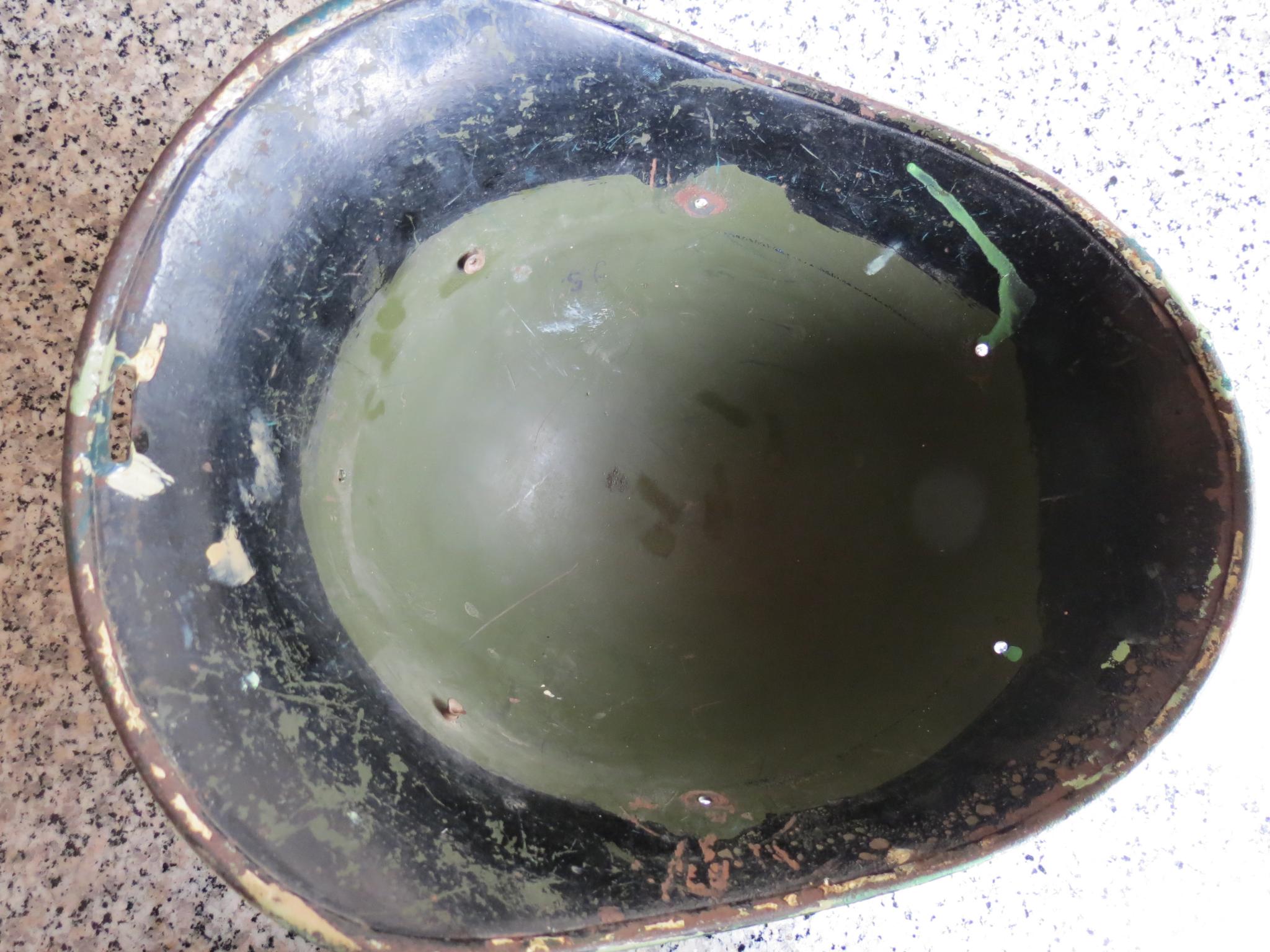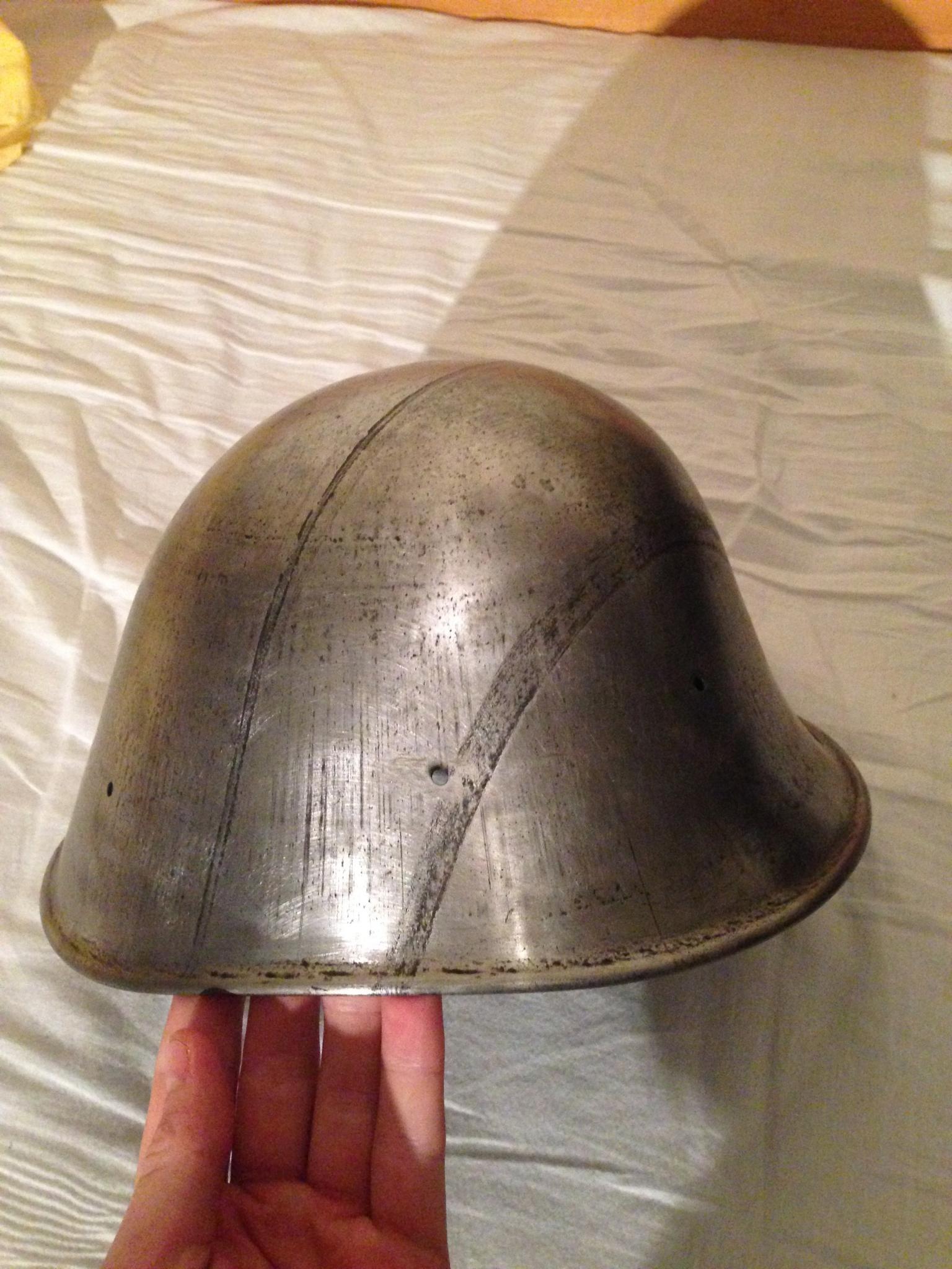 Goed, nadat ik de lasnaad ontdekte en de helm in kaal metaal onwijs mooi vond, kocht ik via MP nog een wat ik dacht waardeloze helm. De helm was blauw-groen geverfd met met daaronder nog een verflaag wit, daaronder zwart en daar weer onder (blijkbaar) de originele legerkleur. Aan de binnenkant was deze wel nog zichtbaar, maar onder de verf was de roest al flink toegeslagen dus ik was genoodzaakt ook deze verflaag weg te schuren. (De roest is na meerdere uren schuren en verschillende chemicaliën te hebben gebruikt nog steeds niet helemaal weg.)