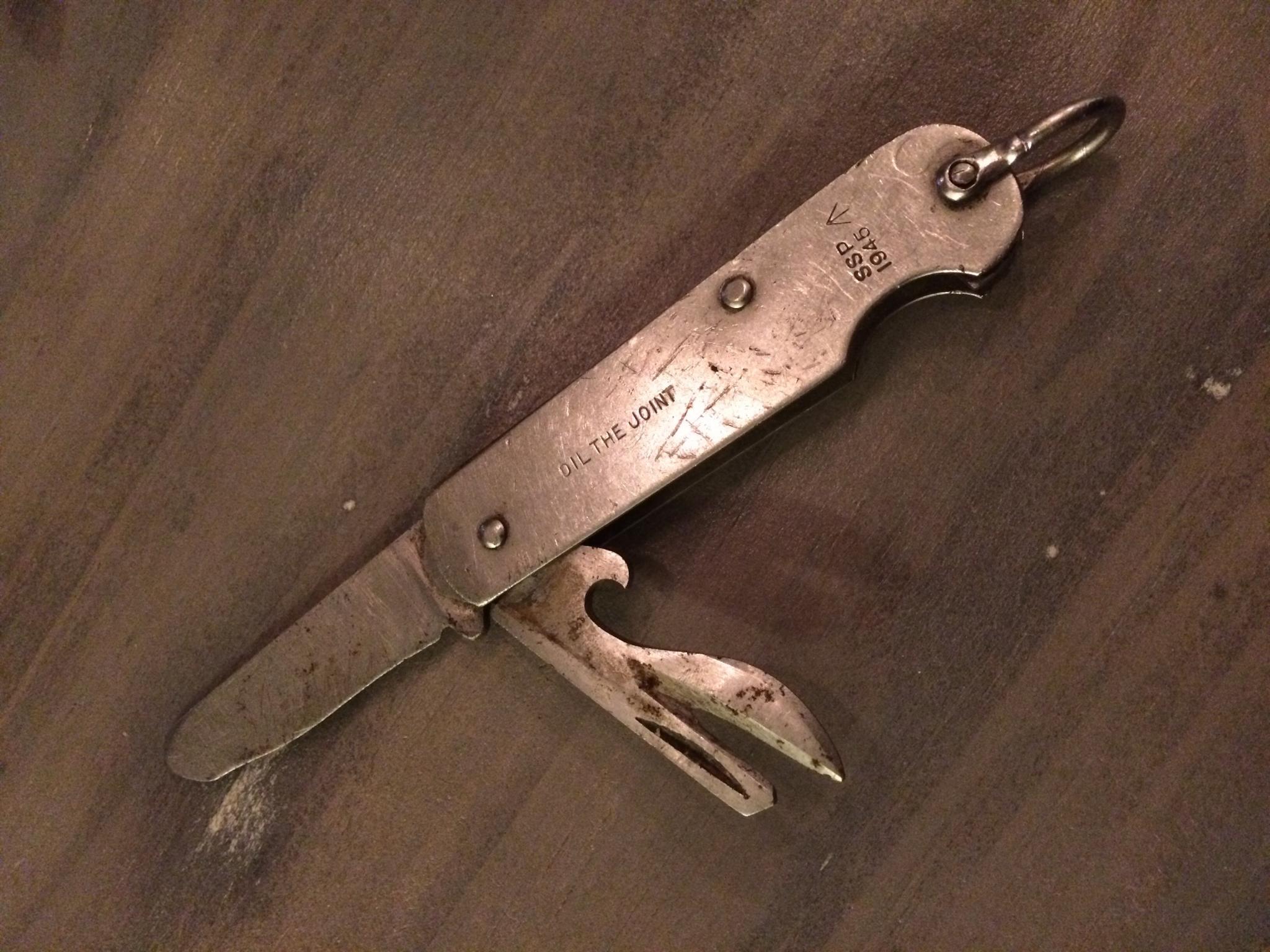 Sinds enkele dagen ben ik in het bezit van een zakmes met daarop de tekst: oil the joint" en "ssp 1945" en een pijl.