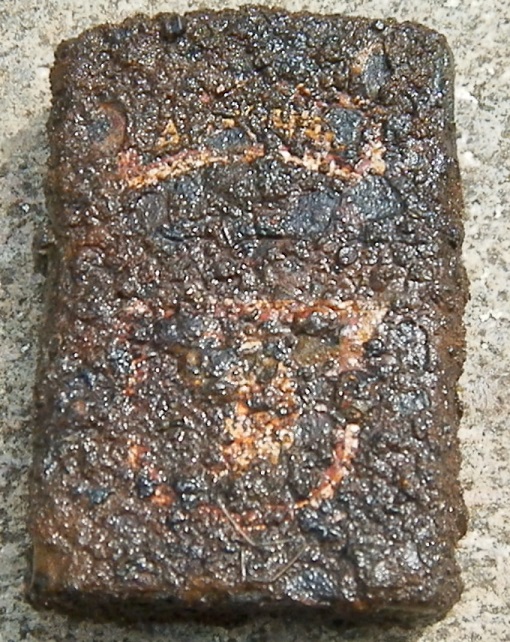 Deze aansteker uit een schutterput gehaald er lag eerst een maschine onderdeel in op ongeveer 1 meter graven naoorlogs er in gedumpt toen ik het er uit had de detector er nog even ingehouden en nog een kleiner signaal op ongeveer 30 cm dieper kwam ik op de bodem van de put en daar kwam deze zippo naar boven lijkt me wel oorlogs ik weet dat ze nog gemaakt worden met deze emblemen er op maar niet op deze manier