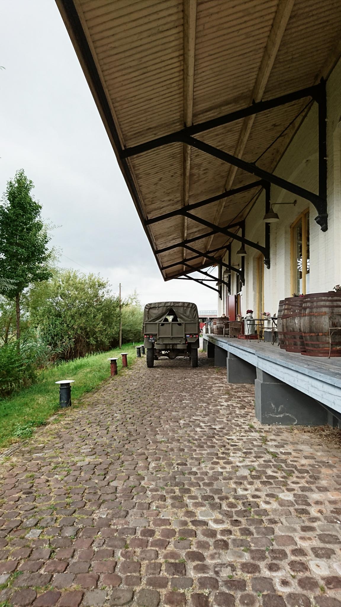 Oude militaire vier ontmoeten oude treinen.