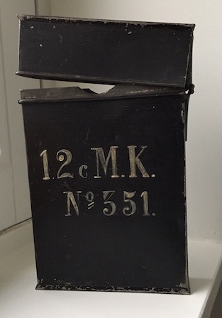 Lettertype was niet echt gangbaar meer in de jaren dertig. Betreft het de zijkant van een houten kist, dan klopt de kleur in ieder geval. Wel een vreemd model dan: hoger dan breed. Manschappenkistjes moesten onder een bed geschoven kunnen worden.