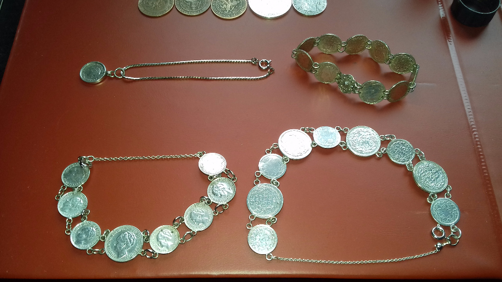 Jammer genoeg zijn de munten onderling aan elkaar gezet doormiddel van aangesoldeerde oogjes en in sommige zijn gaatjes geboord. Dit maakt ze voor een muntenverzamelaar minder interessant. De waarde zal dan ook niet veel meer zijn dan de zilverprijs.