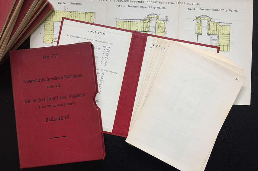 Een andere recente aanwinst. De deeltjes uit de bekende V.I.S.-reeks komen doorgaans vaak voor, maar deze wat minder. Het gaat om de cassette met daarin bijlage iv van het voorschrift over de 'Bouw van zware gewapend-beton schuilplaatsen' (V.I.S. vii, no. 77f). Ben er heel blij mee, want ik zocht er al een tijdje naar. De cassette bevat 45 vaak dubbelzijdige bladen van verschillend formaat. Hieronder een kleine impressie.
