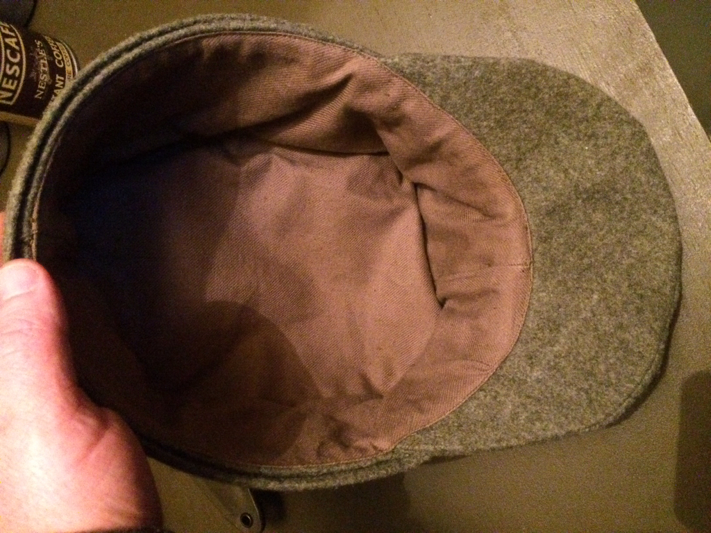 Ik zou graag jullie mening willen over deze M43 Einheitsmütze. Hij is qua kleur veel minder groen dan de Feldgraue (laat-oorlogse m44 versie?), het garen is katoen (licht niet op met blacklight), toestand is erg mooi.