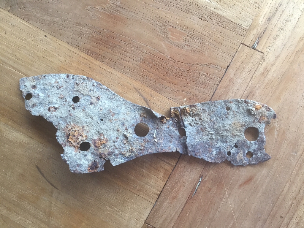 Temidden van een handvol duitse patronen deze vondsten gedaan. Lijkt mij de stalen plaat uit de zool van een Duitse laars? Het koperen plaatje kan ik niet plaatsen. Als iemand een idee heeft hoor ik dat graag!